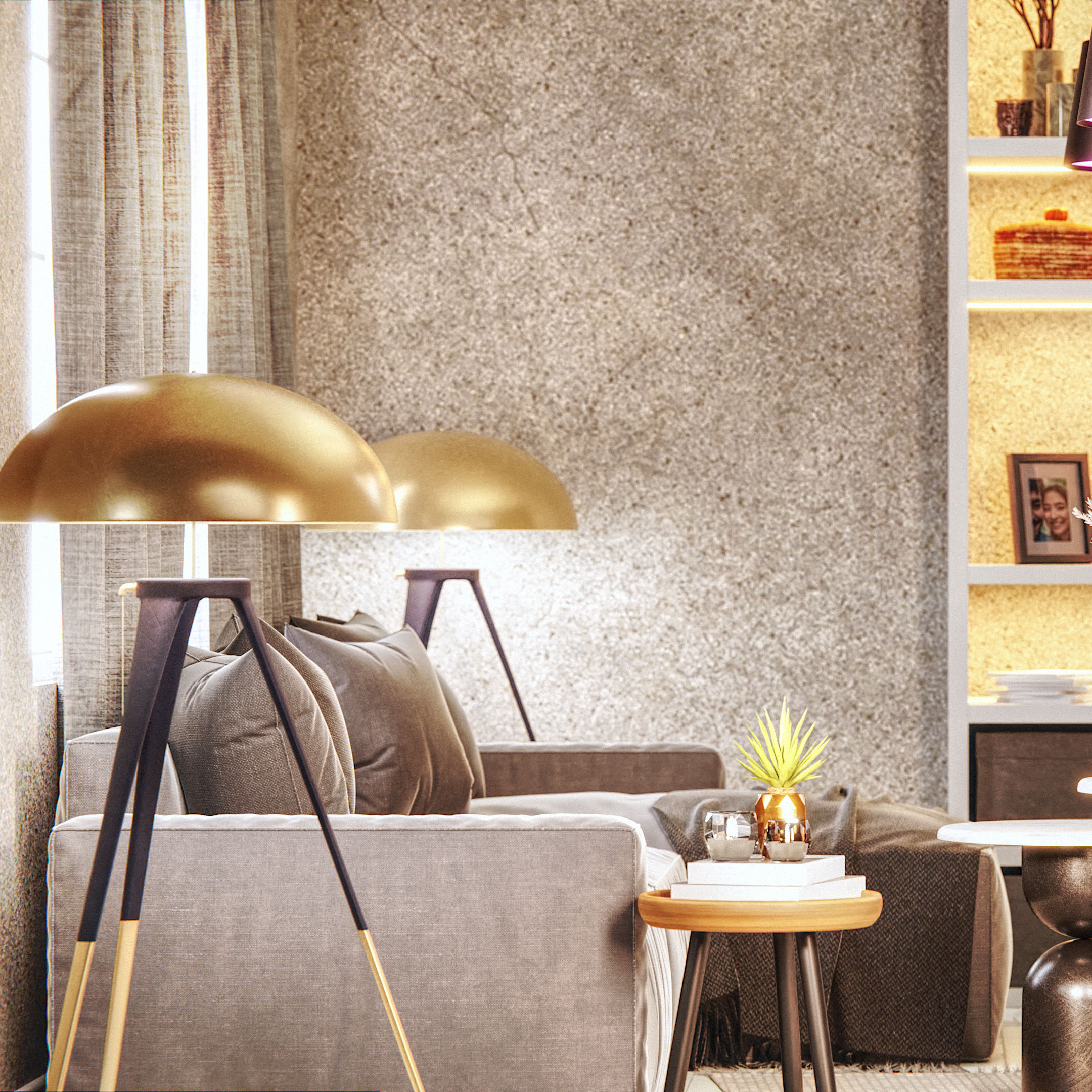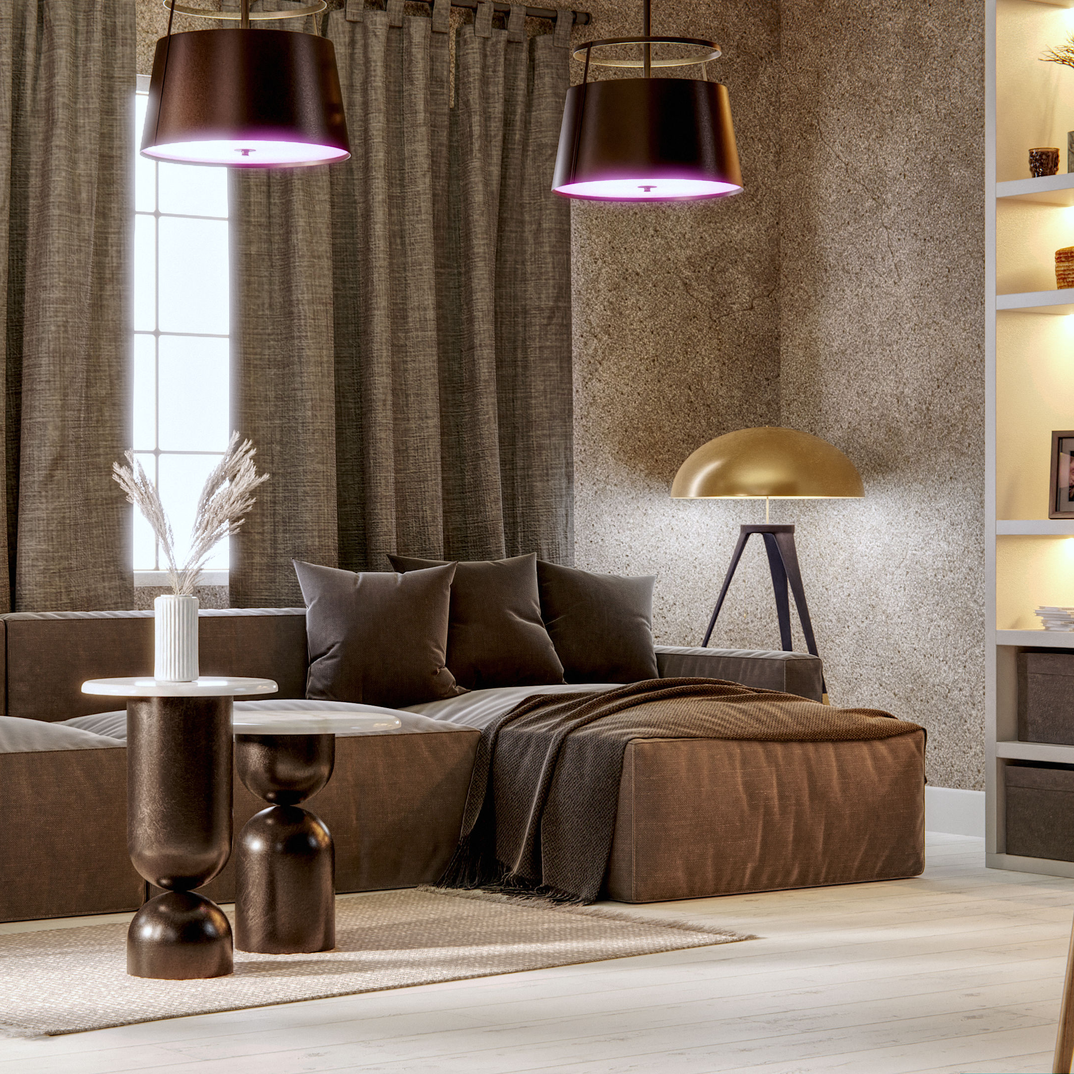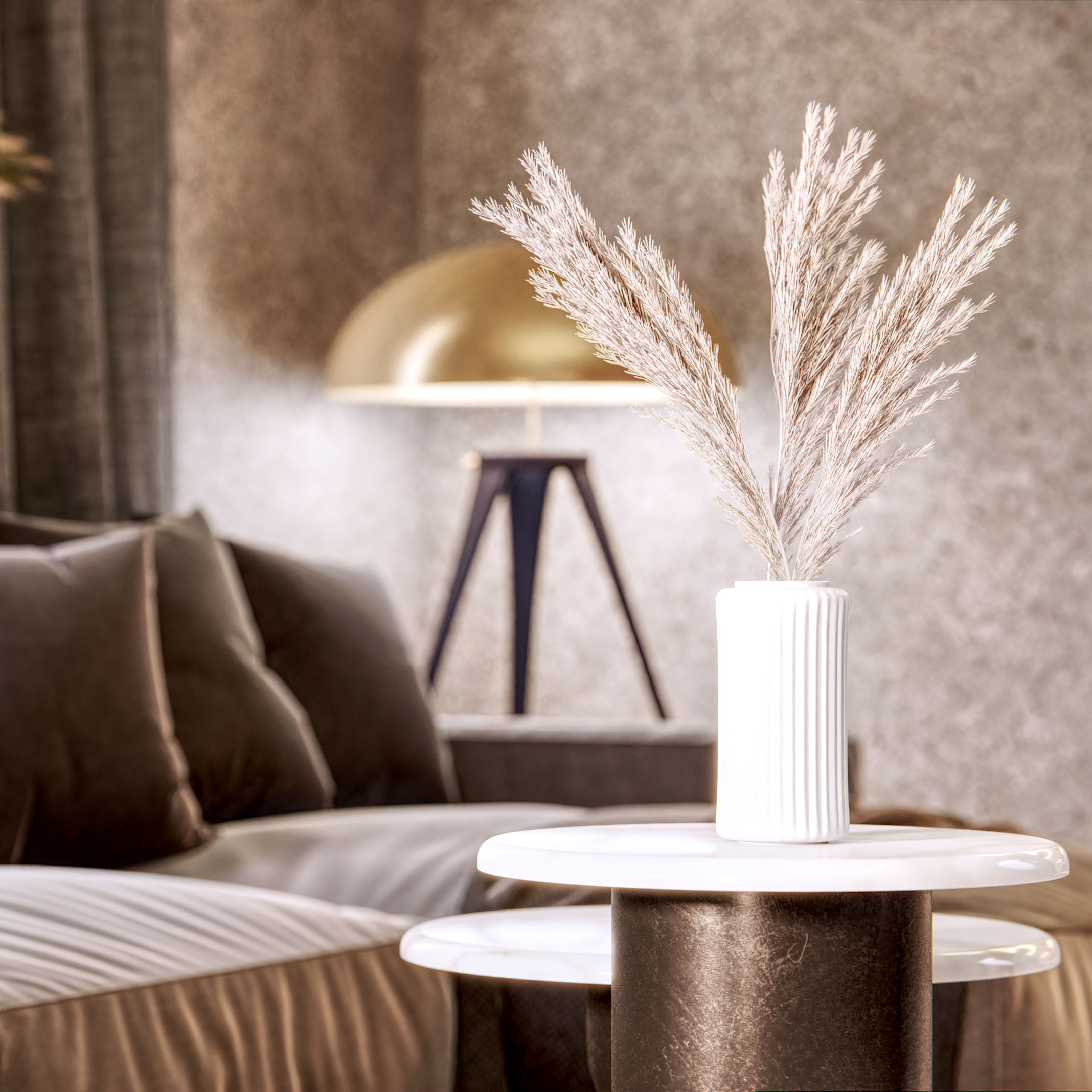 Wizualizacje 3D przedstawiają wnętrza nowoczesnego mieszkania, utrzymane w naturalnych barwach. W projekcie mieszkania wykorzystano wysokiej jakości materiały, uzupełniając wnętrze roślinnością, która doskonale prezentuje się z ciepłym odcieniem drewna.