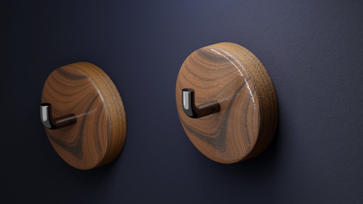 Wizualizacje przedstawiają wieszak na ubrania. Są to wizualizacje produktowe. Wizualizacje prezentują obiekt z różnych stron. Ujęcia z bliska pozwalają pokazać fakturę materiałów. Wizualizacje wieszaków na ścianie pozwalają pokazać, jak będzie się on prezentował w mieszkaniu.