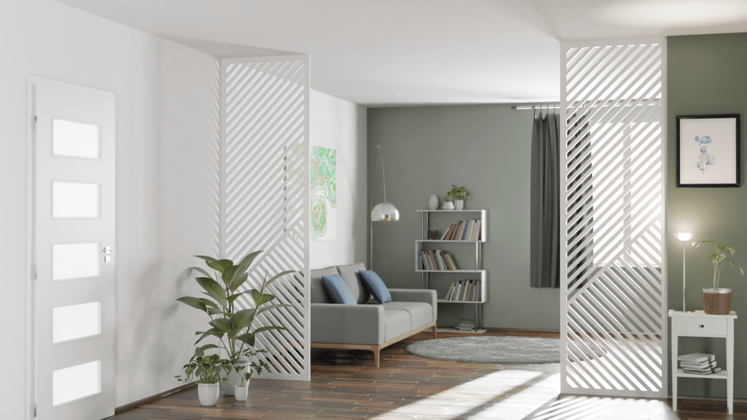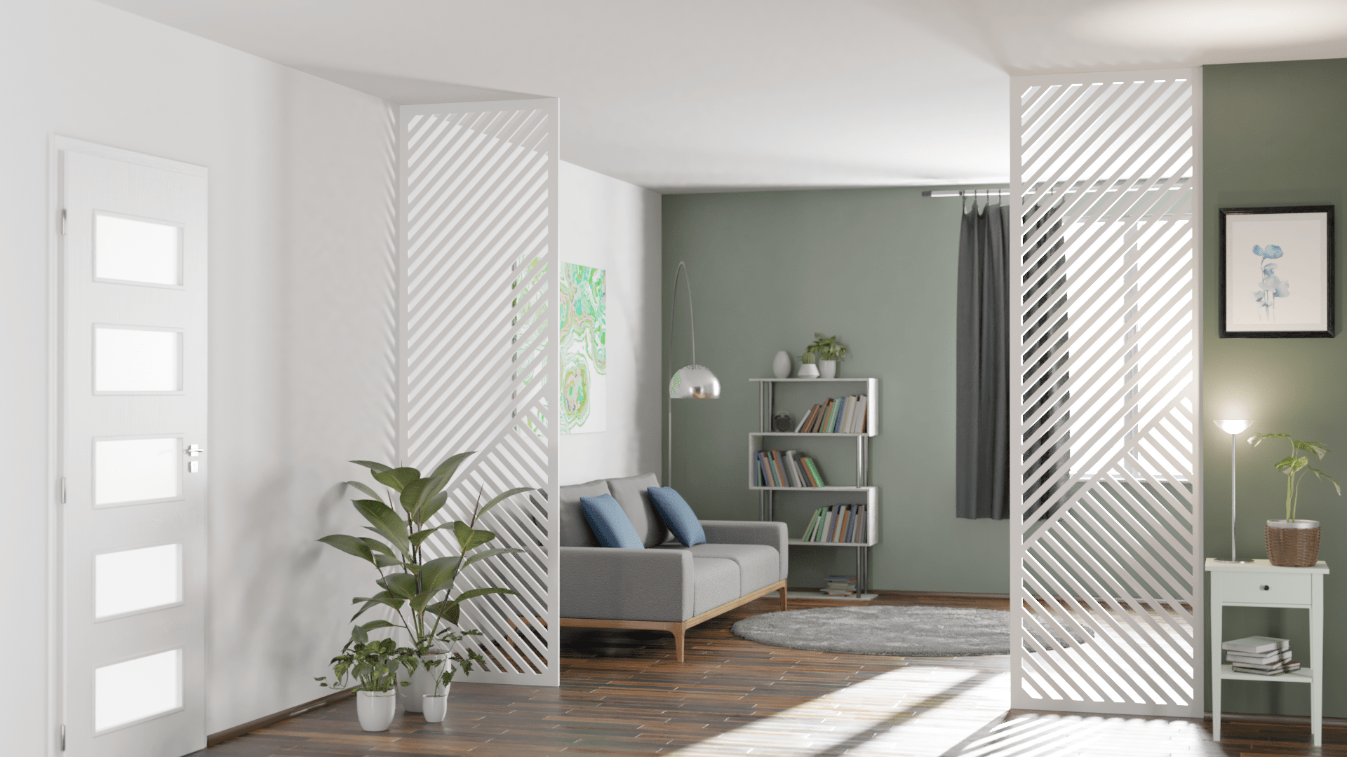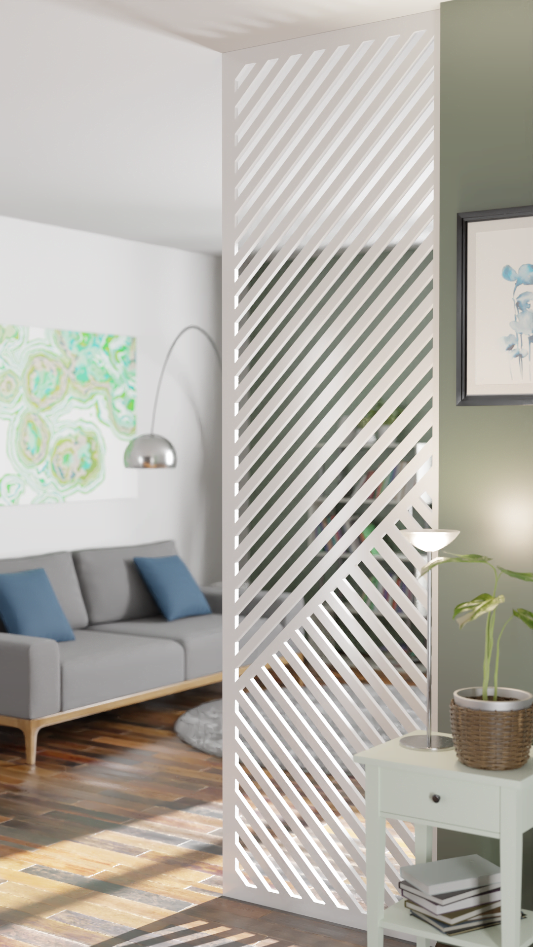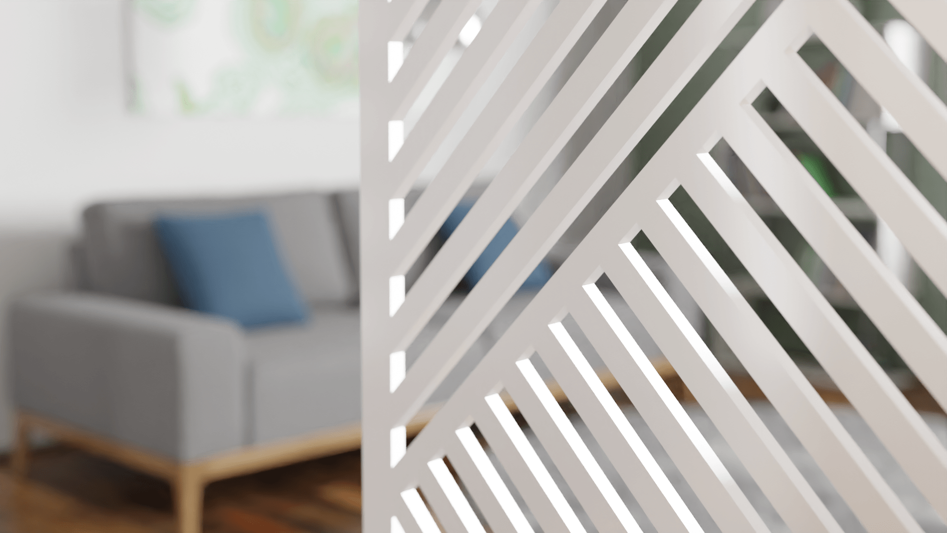 Wizualizacje przedstawiają ażurowe ścianki, zaprezentowane we wnętrzu mieszkalnym. Są to wizualizacje produktowe. Wykorzystana w wizualizacji kolorystyka i oświetlenie, pozwalają pokazać prezentowany produkt tak, aby wyeksponować jego najlepsze cechy i największe zalety.