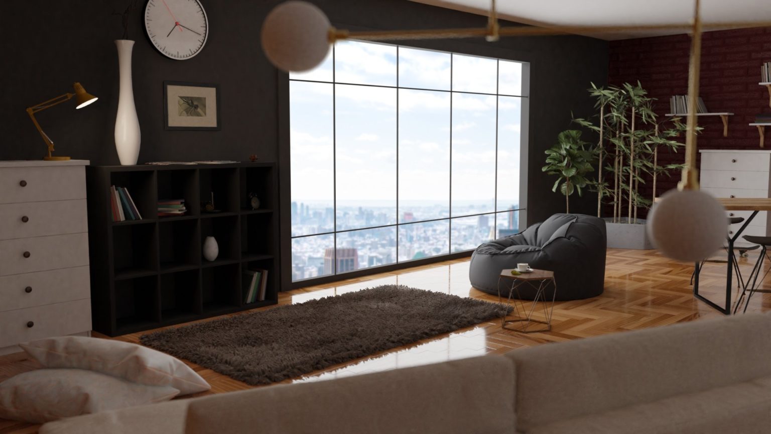 Wizualizacja przedstawia atrakcyjne nowoczesne mieszkanie, znajdujące się na ostatnim piętrze Warszawskiego wieżowca.