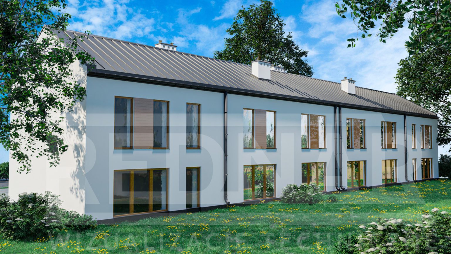 Wizualizacje przedstawiają budynki jednorodzinne w zabudowie szeregowej. Jest to przykład wizualizacji architektonicznych. Dwa ujęcia, pozwalają zaprezentować, jak będą wyglądały budynki od strony ulicy, oraz od ogrodu.