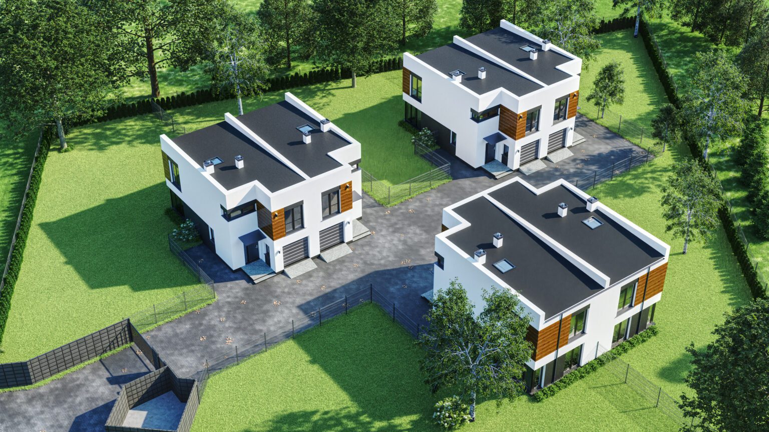 Wizualizacje 3D przedstawiają osiedle domów jednorodzinnych w zabudowie